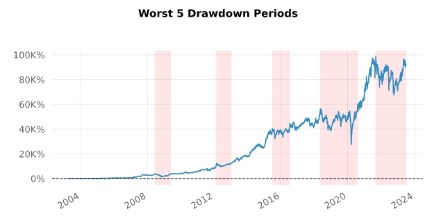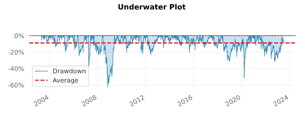 최대손실률(MDD)과 언더워터피리어드 등 이 전략에서 우리가 견뎌내야할 백테스트 결과들을 알아보겠습니다.